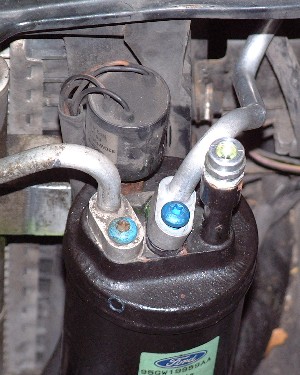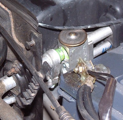 The High Pressure pipe, (sometimes known as the Liquid Line), runs from the receiver/dryer mounted by the front nearside headlight, underneath the air-filter housing and - on the 24V at least - along the nearside wing behind the nearside MacPherson strut turret and reaches the AC evaporator housing through the engine bulkhead. At the 2004 Orpington Meet John Orford from Aircon Direct noticed that the pipe on my Scorpio Ultima was suspect.