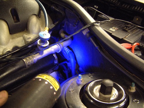 Below, a UV light test of the pipe as it nears the bulkhead. The larger diameter pipe above is the Low-Pressure pipe (gas line) - the gas has been evacuated from the system through this point. Below the metal pipe is the smaller diameter High Pressure pipe, which is mainly rubber and has metal connections crimped at both ends. Here the crimp is leaking. Although it does not show clearly on this photo, the UV lamp shows bright traces around this joint - the crimp has failed and the system has lost a lot of gas. Mark, from Aircon Direct came out to me to fit the new one I had bought (from Ford Parts UK, excellent service, thanks guys.) The pipe runs from the regulator block where it is clamped with a single screw and an H clamp with the Low Pressure pipe above it. In order to release the torx screw securing the H clamp the battery shelf needs to be removed. The rubber bonnet seal is pulled off the top of the bulkhead and the two 'fir-tree' fasteners are pulled off on each side. The battery partition is then removed from the bulkhead, leaving much more room to get to the regulator block. Above, the battery shelf is exposed. To the left of the battery the regulator block can just be seen.