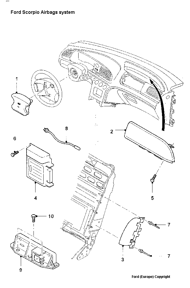 The Scorpio, of course, has inertial reel belts fitted as standard, plus a fixed lap belt for a fifth passenger in the centre of the rear seat. As additional safety, the car also has a driver airbag fitted as standard, and originally the passenger front airbag was an optional extra, later fitted as standard, while even later side impact airbags were optional. These were fitted into the upright part of the front seats. Additional protection is offered by seat belt pre-tensioners, Together these are called the Supplementary Restraint System. It should be noted from the outset that the airbags can only be effective when the seat belts are worn. During a severe frontal impact, the vehicle stops suddenly. At only 30mph the vehicle is covering 44 feet per second, and any body which has mass has inertia. When the vehicle stops, the passengers' inertia drives them forward until they collide with something. Without airbags, the drivers upper body crashes into the steering wheel and the fascia (Americans call this the crashpad) while his head impacts and drives a bulge into the laminated front windscreen. For the passenger who is not restricted by the steering wheel the front fascia and windscreen await to provide bone crushing injury. Almost everyone by now must have seen the crash-test dummies on high-speed film flying forwards in slow motion, jerking and threshing about as different parts of their bodies impact with the interior crushing in towards them. It is uncomfortable viewing, but necessary so that one can appreciate the forces involved. To control the restraint system there is, of course, the control module, which is mounted behind the lower fascia to the right of the steering wheel column. This monitors the system and turns on a light in the instrument panel if it detects a fault. The module also stores fault codes for retrieval by FDS2000. The Air Bag Electronic Control Module is connected, in series, to two separate sensors, a crash sensor and a safing sensor and only if both detect a crash the ABECM (4) deploys the system. On vehicle with side impact airbags (3) a third sensor is tuned to detect side impacts (9). The drivers airbag (1) is mounted behind the steering wheel cushion to emerge through engineered weak points on the cover. This is connected with a mylar 'clockspring' to the steering column to enable the steering wheel to turn without stressing the connections. The airbag has a 30 litre capacity and a single propellant cartridge. The passenger airbag (2), where fitted, deploys from behind the fascia airbag panel, which is designed to pop open and is restrained with a strap. The passenger has the benefit of a 60 litre bag filled from two cartridges. The airbags are fired electrically by the ABECM by an igniter built into the propellant cartridge. Note that the cartridges contain propellant rather than explosive: propellant does not explode, it converts itself into a very large volume of gas in a very brief period of time. Because airbags are truly effective when the seat-belts are very tight, but people do not as a rule prefer to be clamped rigidly to the seat, seat-belt pre-tensioners are also used. There are two types or pre-tensioner: one uses the inertia and/or deformation of the front of the vehicle to drive the seat-belt anchorages backward, and others use propellant. In the case of the Scorpio, where fitted, the pre-tensioners form part of the seat belt anchorage. The cable for the seatbelt catch is a friction fit through the floor mounting and ends in a closed chamber, behind which is a small propellant charge. When the system fires, the cable is forced backwards by several inches, clamping the seat belt wearer irresistibly to the seat and preventing them from gaining too much acceleration or twisting before they hit the airbag. As their name implies, the pre-tensioner only fires before or at the same time as the airbags are deployed, and never afterward. Fault Finding Serious injury can result by being too close to an airbag when it is deployed. Before making or breaking any connection in the system there should be a delay of at least 15 minutes after disconnecting the battery. When removing an airbag, especially from the steering wheel, keep your head away from the airbag face. Because the igniters are fired electrically, a circuit tester or multimeter should not be used on any Restraint System wiring. If the airbag warning light comes on in the fascia, owner action is to checking the fuse: Fuse 27 in the central fuse box, 10 amp This also provides some of the power to the ABS system, so if the ABS light illuminates as well, it is probable that this fuse is at fault. SRS Fault Codes Fault codes are flashed by the airbag light. A single flash with a few seconds between it is Code 1. A double flash and a pause is code 2 and so on. The codes are as follows: 1 Flash Drivers