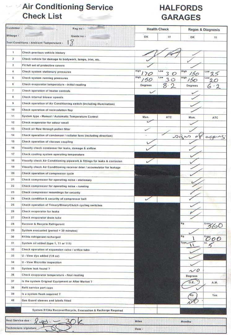 been recharged with 1000g and oil topped to 160ml to comply with the issued tsb