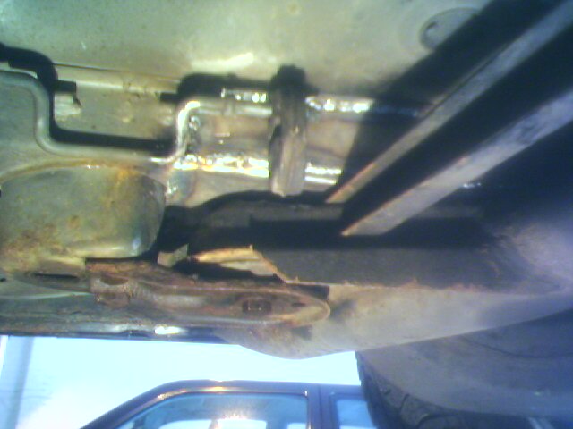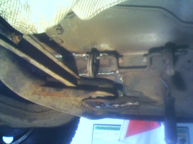 Right hand side From below Words and phone pix by Bob Lavens 14/04/2005 - thanks Bob! NOTE This above is the opinion of a welding engineer reported by Bob. I have my own engineer who checked my estate today, and found absolutely no evidence of corrosion or cracking on any part of the rear chassis. I strongly suspect that Bob's car was actually grossly overloaded at some point, either by towing or load, resulting in a flexing of the chassis. The subsequent damage would have been aggravated by the action of the self-levelling suspension. An overload on the luggage deck would have acted against the fulcrum caused by the lifting action of the levelling suspension - the resultant strain on the main chassis rails would have been colossal. If this had been a design fault or inadequate metal, as is alleged, then this would have been a common sight by now, and very well known in the trade. My own MOT man has never seen this on any Ford estate, so I think Bob has just been unlucky. EricR
