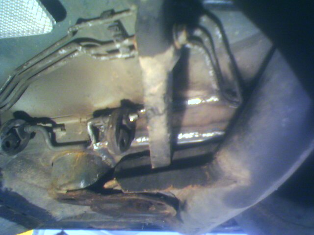When the MOT inspector‘s report was read out to me I nearly wept 'cos on seeing the rust I thought “It’s a long job” I was right and my welding engineer told me what it entailed: 1. Dropping the whole rear axle and exhaust. 2. Making up new sections. 3. Welding them on. 4. Putting everything back 2 and 3 are the easy bits and so is 4. But 1 is a B (that is the only letter I think the Web Bosses will allow of that Word) The main bolt that goes through Big Isolation Rubber Bush into the captive chassis nut is the main bugbear as it can seize solid but luckily mine came out with Plus-gas and perseverance by the guys at the garage! I couldn’t take any photos while they were doing the job but they kindly let me take photos of the welded job before they painted and finished the bolting up.
