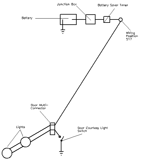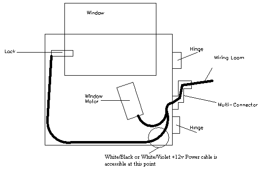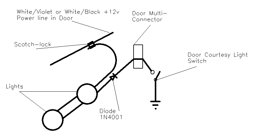 Original Schematic In-door only wiring If all doors and boot are open on a car with footwell lights as well, the total drain will be the best part of 100W. So you can see why a saver circuit is a good idea. Unfortunately, the saver-controlled wiring position S17 is believed to lie behind the dashboard, and gaining access to it is not easy. So this piece describes a simpler way to connect the lights, using the internal door wiring +12v line to the door lock. This keeps most of the work inside the door, and saves threading long lengths of cable through the car. The down-side is that there is no battery saver circuit, so the doors should not be left open with the lights on for ages!. \par \par The internal door wiring looks like the drawing below. There is only one appropriate wire to power the lights in each door, which is contained in the loom at the point specified. It is usually easy to separate the wires at this point, and I think that all cars will have this particular wire. It is coloured White/Violet in the front doors, where it comes from pin 16 of the multi-connector, while in the rear doors it is coloured White/Black, and comes from pin 6. It is +12V at all times that the door is unlocked, and connected to earth when it is locked. In each door I tested the wire with a multi-meter and a dressmakers pin to be sure I had the right one before connecting.