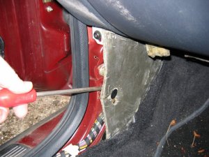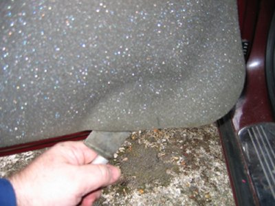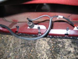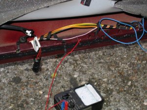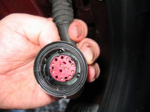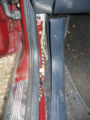 Wire through front connector The front of the car was more tricky. The plastic panels by the sills have to be undone before levering off the trim in the footwell. Then I was faced with some sound proofing, held down with a plastic plug. After levering the plug off, I could just get my hand behind the sound proofing to touch the multi-connector. To release the metal lip which retains it, I had to cut a flap in the sound proofing and use a long screwdriver to lever the lip up, working blind. Then I had just enough room to remove the multi-connector base. The cable could then be passed through, and the base replaced, as with the rear example. It is probably possible to pass a wire through the multi-conector base without removing it, by using a small mirror to view the holes, and a stiff wire to push the other wires aside.