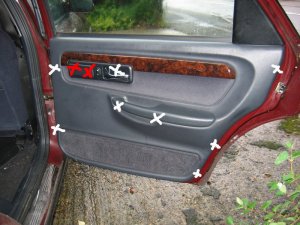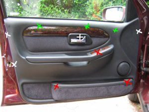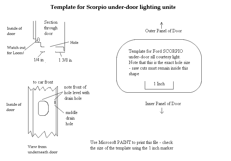 Doing the Work Needed: 4 sets of under-door lights Holes to put them in (see Template above) 4 Scotch-locks for 5A wire 4 diodes - 1N4001 will do A cross-head screwdriver and a flat one with a long shaft About 5 yards of thin 2A wire. A large knife 1 foot long metal tube about 3/16" in diameter (see Step 3 below!) Wiring ties if you cut any Soldering iron, or some method of connecting and insulating wires. Nice to have: The full wiring harness, including multi-connector plug and socket A multi-meter pins and sockets for the multi-connector Process Step 1 - I made up the connections. If I had the full harness I might have looked for power from a different point inside the car body. Point S17, if I could find it, or the footwell lights if I had them were possibilities. If I had the pins/sockets for the multi-connector I would have broken the wires at this point and installed the extra connections. I decided to make up a harness plug from filler, but I could have bought an original plug, or cut the Ford one off and soldered extension wires directly on.\par \par For my door-connector loom the following cables were extended from the end of the light harness plug: - a cable approx 1ft, ending in a Scotchlock, for connecting to the in-door power cable +12V.\par - a thin cable approx 3 ft, for connecting through the multi-connector to the door-open switch. (But not attached yet - the cable will need to be threaded through some narrow spaces first!). Note the (hard to see!) diode attached to the plug in the picture below. Made-up plug and harness picture Step 2 - I removed the internal door panel. A detailed write-up on how to do this is described at http://www.fordscorpio.co.uk/doorlockrep.htm but a picture is included below showing the location of the screws. There are 6 in the front and 10 in the rear, some hidden under the arm-rest or behind the window switch panel but once undone the panel lifts up and away from the door easily - the easiest of all car door panels I have ever removed! In the pictures the white crosses are visible screws, the red ones are hidden behind a cover, while the green ones are push studs connecting behind the door.