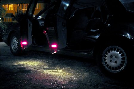 Front Door Panel Rear Door Panel Behind the panel is sound proofing sponge foam. I unsealed this at the bottom of the door, using the knife to cut through the mastic and peel the foam plastic away. If the weather is hot it comes off easily. It will immediately join again if you push it back. Sound proofing separation At this point I could install the light units. There is a little steel spring clip which holds them onto the door skin. It's also a good idea to find and test the power cable which will be used - I used a dressmakers pin to connect to it. Light unit installed Testing the Power wire Step 3 - The hardest job is to connect the earth lead from the light harness through the multi-connector to the courtesy switch. Since I did not have the extra pin/socket for the multi-connector I passed the cable directly through the holes in the multi-connector where the pin/socket is missing. Cheeky, but it works, and can easily be upgraded later if necessary. The only difficulty is that you need thin wire \endash standard 5A is too thick. The actual drain when running is 1A, so 2A wire should be fine. Multi-connector Multi connector open Missing holes After undoing the multi-connector, (it turns easily), I prised off the rubber hose which carries the wires through into the door at the connector, and pulled it out where it connects into the door. Then I pushed the metal tube up through it, so I could easily thread the earth wire through. Did you wonder what it was needed for? It's easiest to begin in the middle, by pushing the wire through one of the spare multi-connector holes. Then I passed it through the metal tube in the rubber hose, and removed the tube. Finally, I connected the earth wire to my diode and plug. Releasing rear trim Rear trim internal connectors Next I went inside the car, and removed the trim behind the multi-connector base. For the rear doors multi-connector it can be prised out with the knife. The base of the multi-connector is held with a lip which can be bent up, allowing the multi-connector to be rotated and removed. I passed the cable through the hole in the side of the car, then the hole in the multi-connector base which corresponded to the hole I had used in the other half. Once done I replaced the multi-connector base.