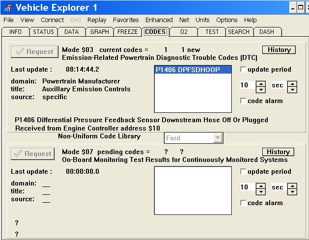 As well as OBD codes, there may be Ford-only codes in memory and these can be requested while the main Codes page is selected, using Enhanced on the Title menu. A separate Enhanced Diagnostic Codes page opens. Click on the Request button and after a few moments the PCM will reply with any Enhanced codes in memory. These codes will probably report the same concerns as the OBD with a slightly different number - beginning with a 1 instead of 0. In this case the P1406 is a Ford code anyway.