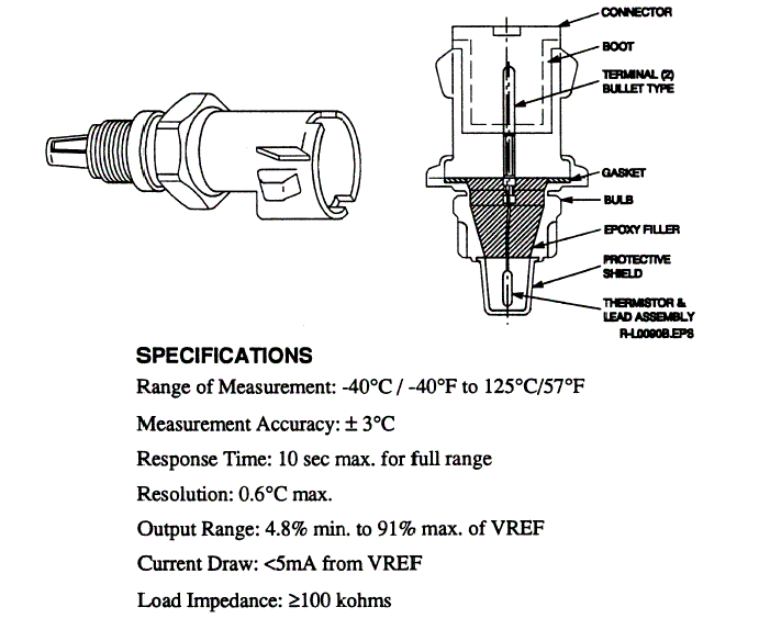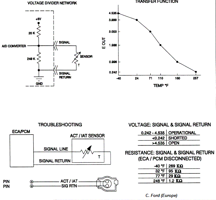 Intake Air Temperature (IAT)Sensor Data The IAT sensor is a temperature sensitive resistor (thermistor) connected to the internal resistor network in the Powertrain Control Module, the EECV, and it provides a output voltage inversely proportional to the intake air temperature. The sensor element is a 0.095" diameter disk thermister with soldered leads and a plastic protective coating. IAT data is shown below. NOTE: At ambient (and only ambient) engine temperature both the IAT and the ECT resistance should show the same value. For a table of readings to temperature, see