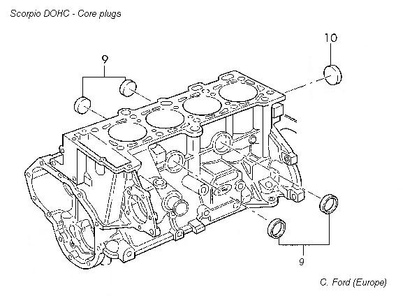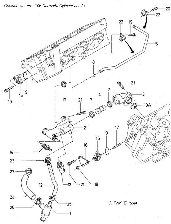 Above, the DOHC engine block. The items marked (9) are the core plugs on the side of the block. These can be checked with a torch from above and below the engine. The V6 engine block have much the same core plugs in the same place, except that there are three on each side. But what's this (10) ? Yes, it's another core plug - on the end of the block, right behind where the flywheel or drive plate would be. With the bell housing in place a corroded core plug here could bubble and spit away quite unnoticed, on a manual soaking the clutch driven plate and causing it to judder. On an automatic there will be no sign of it at all, apart from, like the manual transmission, a trace of coolant or rust at the bottom of the bell housing where it joins with the engine block, and probably traces of rust and coolant on the start motor pinion if it is removed. This same contamination can cause the starter pinion to stick. Once the leak becomes severe, when hot and the pressure is high, coolant will run from this flange and will be seen dripping onto the road. A new one only costs about 79 pence, but it needs the gearbox dropping out, the clutch and flywheel removed to get at it. Punch the old one out with a screwdriver, then clean the hole with wet-and-dry, rubbing around the hole, not in and out. Paint the inside of the hole with ordinary oil-based paint, then tap the core plug in using a 22mm socket and a mallet. Drive the core plug into the hole so that it remains square and the paint will help to seal it and to prevent the scratches caused by installing it from corroding all over again. Heater Matrix This can be the cause of another invisible leak. It is often accompanied by a curry smell in the interior, and perhaps the windscreen misting up more than usual. Check the carpet over the transmission tunnel under the heater. If it's wet, check the moisture - does it smell of coolant? If not, it might be water from the aircon Evaporator or the battery shelf. If it is coolant you have some work to do, but it is quite possible to carry out the work yourself. Cosworth Cylinder Heads When Cosworth redesigned the cylinder heads of the V6 Cologne to a modern pent-roof design, with four valves per chamber and two cams per bank, they raised the BHP from 147 to 207. This obviously enormously increased the heat that had to be dissipated, so a new coolant circuit was added between the cylinder heads, together with a pipe running between the V to provide a flow to the internal heater matrix.