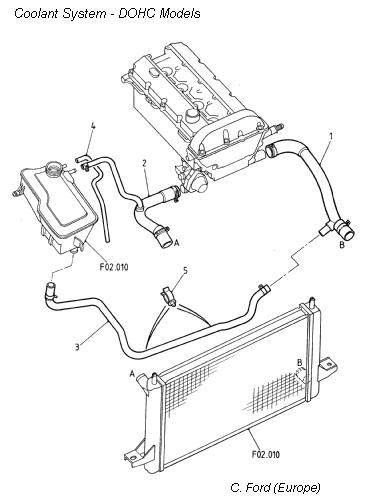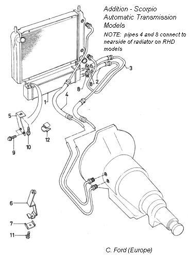 Coolant Leaks This page is a trouble shooter for the various coolant systems used on the Ford Scorpio and it is intended to help the owner locate and deal with coolant leaks. The coolant circuit on all of the Scorpio engines are closed-systems. They are not exposed to the outside air, but use an expansion tank sealed with a lift-off pressure cap to allow for expansion and contraction of the coolant. This minimises losses through evaporation, so any lowering of the coolant level inside the tank should be investigated quickly before damage occurs elsewhere. If you are constantly topping-up the coolant there must be a leak - however, finding it is not always easy. VISIBLE LEAKS When the engine is cold, jack up the front of the car onto axle stands, remove the under-engine cover (and the Cosworth engine cover on the 24V) and examine all of the pipe work closely. Common problems are: Water Pump spindle - as the water pump is spinning it needs a sealed bearing, or gland, to allow the shaft to rotate yet keep in the coolant. This shaft and the gland wears over time, and finally the coolant will escape through an expansion hole on the underside of the spindle. Quite often this coolant is thrown outwards by the pulley so that a line of coolant/rust is visible across the front of the engine bay. Cosworth owners - be aware that the water pump spindle bearing on the Cosworth should be fitted with a small pipe that carries any leakage away from the front pulley, so look for this first. EVAPORATOR DRAIN Be aware that clear water can drip down behind the engine from the evaporator drain tubes when the AC or CC is on during humid days. This is moisture extracted from the air entering the cabin through the evaporator and is often seen as a puddle after parking for a while after a run. I have been approached many times by helpful people in car parks who have pointed this out to me, thinking that this is a coolant leak - do not be alarmed, it is quite normal. This drip of clear water may also cause a hiss noise as it drops onto the very hot catalyst after run. Radiator Look for leakage along the seams and the vanes of the radiator and along the bottom. Laying underneath the car looking upward with the aid of a torch you should be able to inspect the front of the radiator behind the airconditioning condenser. Cosworth Owners - if you see the radiator 'ballooning' - that is, showing signs of swelling along the vanes particularly along the bottom, then you are another victim of this syndrome. We recommend that you take the time to change the thermostat when you replace the radiator, or this may happen again. Oil Cooler You might not be aware that on V6 engines there is an oil/coolant heat exchanger mounted on the offside of the engine block included in the oil filter housing. Since coolant always flows through the heater matrix on the Scorpio, (it is the heater doors that close off the heat) this exchanger brings the oil up to temperature quickly, then stabilises the oil temperature so that even on the hottest days the oil stays at about the same temperature as the coolant. Two hoses lead from this housing, one from the heater matrix and the other from the the main bottom radiator hose. The figure below illustrates this - the heat exchanger is the item on the left end of the hose T-piece on (3). One owner reported that this hose had deteriorated and needed to be replaced. Hoses (5) and (6) allow any air bubbles to escape from the circuit into the air space in the expansion tank and if these are blocked (normally at the expansion tank flanges) then the system will be difficult to fill.