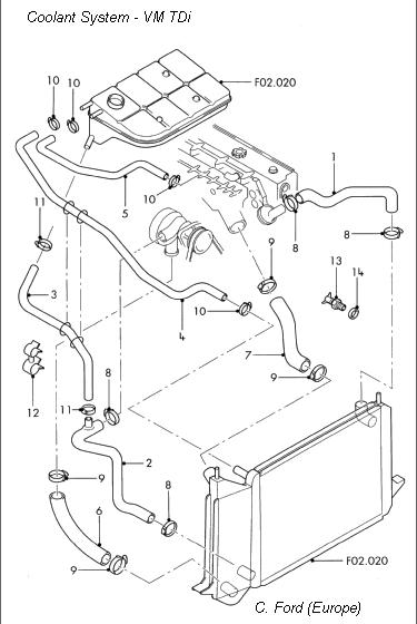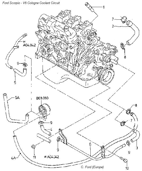 Some owners have reported that the radiator flange for the hose (6) is missing, and the hose left to trail down the side of the radiator. At some stage the correct radiator with this connection has been replaced with the Granada radiator: the hose (6) has nothing to connect to and has been left to the air. Since the hose is connected to the air space in the expansion tank this will normally work, but there will be coolant losses because of evaporation and the ability of the system to remove air locks will be impaired. The V6 Cologne is basically similar, here the cooler is the item numbered B03:030. (This is a catalogue section reference, not the part number.)