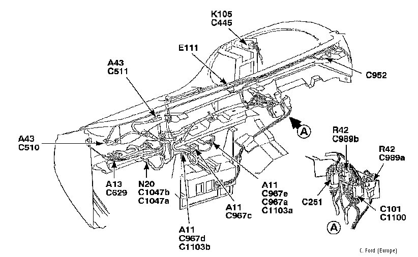 The installation includes the radio with connections C967a, and C967c,