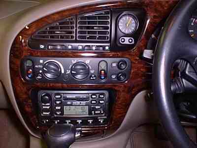 The Climate Control panel. Left and right are the temperature settings for each side. The fan is set at Auto, which changes the boost according to need. A small UV sensor mounted on top of the fascia on the drivers side measures the amount of sunlight, and other sensors check ambient temperature to decide how much cold or warm air to admit to the interior. The CC computer may need a reset from time to time: see Climate Control Reset. Pollen filters on the system are changed during the yearly service. The round buttons on the right of the C/C panel are switches for the heated windscreen and rear screen but, because the climate control removes excess moisture from the air in the cabin, these are never needed. ICE consists of the Ford 7000 series radio/tape/CD controller. Beneath the indicator stalk on the steering column the ICE joystick control can just be seen. Unlike the Granada, there is a radio antennae mounted on the roof forward of the electric sunroof. Aside from fixing the rear speakers (see Hi Fi) and the addition of the Pioneer Sub, the system is perfect. The tenth track of the second CD is playing.